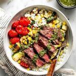 - Slice and Assemble: Once rested, slice the flank steak against the grain into thin strips. Chop grilled vegetables into bite-sized pieces and spritz with fresh lemon juice. Build the bowls using a base of herbed lemon rice and greens, then top with vegetables and sliced steak. Generously drizzle with chimichurri sauce and add optional toppings like cotija cheese and fresh herbs. Serve immediately and enjoy!