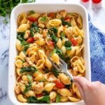 - Combine Pasta & Spinach: Add the hot pasta and fresh baby spinach into the baking dish. Pour in about 1/2 cup of reserved pasta water and toss everything together to combine and wilt the spinach.
