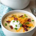- Serve: Ladle soup into bowls. Top each serving with crispy bacon bits, remaining shredded cheddar cheese, sour cream, and additional chopped scallions.