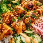 This Bang Bang Chicken Bowl is an easy, flavor-packed meal featuring tender baked chicken coated in a spicy, creamy bang bang sauce, served over rice with fresh veggies like carrots, cucumber, edamame, and herbs. Perfect for a quick yet satisfying lunch or dinner, this bowl combines sweet, spicy, and tangy flavors with crunchy textures for a deliciously balanced dish.