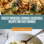 - Assemble the Casserole: Pour the cheesy quinoa mixture into a 9-inch square baking dish. Fold the roasted broccoli into the quinoa to distribute evenly. Sprinkle the reserved ¾ cup cheese evenly over the top, then scatter the prepared garlic breadcrumbs on the very top layer.