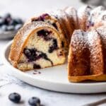 This Blueberry Sour Cream Coffee Cake is a moist and tender Bundt cake filled with fresh or frozen blueberries, a crunchy cinnamon walnut layer, and a hint of vanilla. Perfectly balanced with a subtle tang from the sour cream, this coffee cake is a delicious treat for breakfast, brunch, or dessert. It bakes to golden perfection and is lightly dusted with powdered sugar to add a touch of sweetness.