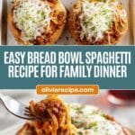 You can prepare the spaghetti filling and garlic butter in advance, but it’s best to assemble and bake the bread bowls just before serving so the bread remains fresh and crisp for that perfect bite.