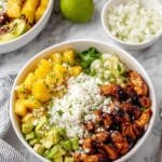 - Assemble the Bowls: Divide the lime-cilantro rice into bowls. Top with grilled chicken, diced grilled pineapple, avocado, diced white onion, a drizzle of salsa verde, and extra chopped cilantro. Optionally, crumble cotija cheese or queso fresco over the top. Serve with lime wedges. Alternatively, serve in warm corn tortillas as tacos.