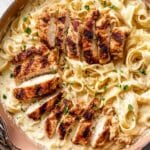 This classic Chicken Fettuccine Alfredo recipe features tender seared chicken breasts served over perfectly cooked fettuccine noodles tossed in a rich, creamy homemade Alfredo sauce made with butter, garlic, heavy cream, and freshly grated Parmesan cheese. Garnished with fresh Italian parsley, this comforting Italian-American pasta dish is a delicious crowd-pleaser perfect for weeknight dinners or special occasions.