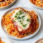 This classic Chicken Parmesan with Spaghetti recipe features tender, breaded chicken cutlets topped with a flavorful homemade tomato sauce, melted mozzarella, and Parmesan cheese, all served over perfectly tossed spaghetti. With a crispy pan-fried chicken base finished in the oven and a rich, garlicky San Marzano tomato sauce, this dish is a comforting Italian-American favorite perfect for family dinners or special occasions.