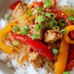 - Serve: Spoon the chicken, pepper, and onion mixture over cooked white rice. Optionally, garnish with chopped green onions and a sprinkle of red pepper flakes for extra color and heat.