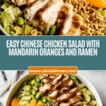 A vibrant and flavorful Chinese Chicken Salad featuring tender marinated baked chicken breast, crunchy toasted ramen noodles with almonds and sesame seeds, fresh napa cabbage, crisp vegetables, sweet mandarin oranges, and a tangy hoisin-ginger dressing. This easy-to-make salad combines crispy textures with savory, sweet, and zesty flavors for a perfect lunch or light dinner.