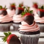Delightfully rich and moist chocolate cupcakes topped with a luscious strawberry buttercream frosting and adorned with chocolate-covered strawberries. Perfect for Valentine’s Day or any special occasion, these cupcakes combine classic chocolate flavors with a fresh strawberry twist, making them irresistible and visually stunning.