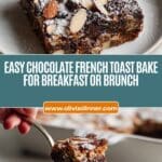 Decadent Chocolate French Toast made with rich chocolate custard soaked pain au chocolat, topped with sliced almonds and baked to perfection. This indulgent breakfast or brunch recipe combines creamy chocolate sauce with buttery croissants for a delicious twist on classic French toast, perfect for chocolate lovers and special occasions.