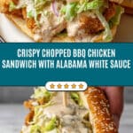 This Chopped BBQ Chicken Sandwich features crispy fried chicken tenders chopped and mixed with a tangy and creamy Alabama White BBQ Sauce, piled high on buttery toasted hoagie rolls with fresh romaine, pickles, and red onion for a saucy, crunchy, and addictive sandwich experience perfect for a quick and satisfying meal.