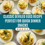A classic Deviled Eggs recipe featuring a creamy, tangy filling made with mayonnaise, pickle juice, mustard, and spices, topped with paprika and fresh herbs for a delicious appetizer or snack.