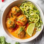 - Serve: Plate the meatballs and coconut curry sauce over a bed of rice or sautéed zoodles. Garnish with additional fresh cilantro, sliced green onions, and a squeeze of fresh lime to brighten the dish.