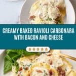 This Copycat Olive Garden Ravioli Carbonara recipe offers a rich and creamy baked pasta dish featuring cheese ravioli coated in a luscious Parmesan cream sauce with crispy bacon, topped with a blend of mozzarella and Asiago cheeses. Perfect for a comforting Italian-inspired meal made right at home.