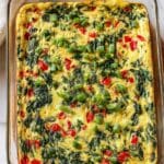 A wholesome and protein-packed Cottage Cheese Egg Bake loaded with sautéed veggies including bell peppers, onions, and spinach. This nutritious and easy-to-make casserole is perfect for breakfast or brunch and combines creamy cottage cheese with fluffy baked eggs, flavored with garlic powder, hot sauce, and fresh chives for a tasty and satisfying meal.