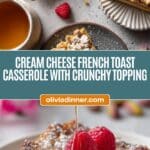 This Cream Cheese French Toast Casserole is a decadent and comforting breakfast dish perfect for a weekend brunch or special occasion. Featuring cubes of French bread soaked in a sweet custard mixture, layered with a rich mascarpone and cream cheese blend, then topped with a crunchy cinnamon oat crumb topping, this casserole bakes to a golden perfection. Serve warm with maple syrup or a dusting of confectioners’ sugar for a deliciously indulgent start to your day.
