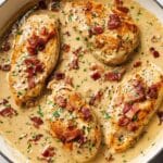 Creamy Bacon Chicken is a flavorful and comforting skillet dish featuring crispy bacon, tender chicken cutlets, and a rich creamy sauce made with chicken broth, lemon juice, and heavy cream. This easy-to-make recipe combines savory bacon fat for cooking and a luscious sauce to create a satisfying meal perfect for weeknight dinners.