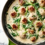 Chicken Florentine Meatballs feature tender ground chicken meatballs simmered in a creamy, garlicky white wine sauce with fresh spinach, making for a cozy and delicious meal perfect for any night of the week.