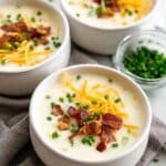 - Garnish and Serve: Remove soup from heat. Garnish with additional shredded cheddar cheese, chopped chives, and reserved bacon pieces if desired. Serve warm and enjoy your creamy potato bacon soup!