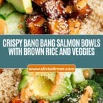 Crispy Bang Bang Salmon Bites Bowls are a vibrant, flavorful meal combining crispy sautéed salmon chunks glazed in a tangy coconut aminos sauce, paired with fresh Asian cucumber salad, steamed broccoli, creamy avocado slices, and brown rice. Topped with a spicy-sweet bang bang sauce, this dish offers a delightful blend of textures and bold Asian-inspired flavors, perfect for a nutritious lunch or dinner.