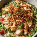 A refreshing and crunchy Chicken Crispy Rice Salad tossed with vibrant vegetables and coated in a creamy, tangy peanut dressing. The salad features golden, crispy jasmine rice and tender pan-fried chicken breast, delivering a perfect balance of textures and flavors—ideal for a light yet satisfying meal.