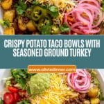 Crispy Potato Taco Bowls combine oven-roasted Yukon Gold potatoes with flavorful seasoned ground turkey and a variety of fresh, zesty toppings. This dish is a delicious twist on traditional tacos with a satisfying crispy potato base, perfect for a hearty and customizable meal.