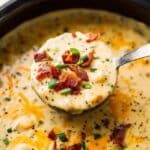 - Serve and garnish: Ladle the hot soup into bowls and garnish each serving with chopped green onion, extra shredded cheddar cheese, and the remaining ¼ cup of cooked bacon pieces if desired. Serve immediately for the best flavor and creaminess.