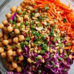A vibrant and crunchy Thai-inspired chickpea salad featuring a medley of fresh vegetables and herbs tossed in a creamy, zesty peanut dressing. Perfect for a quick, nutritious, and flavorful meal or side dish, this salad combines refreshing textures with bold, layered flavors influenced by traditional Thai cuisine.