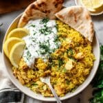 This Dump-and-Bake Chicken Tzatziki and Rice is a simple, one-pan meal that combines marinated chicken, aromatic spices, tender rice, and grated zucchini baked to perfection. The dish is finished with refreshing tzatziki sauce, fresh herbs, and lemon for a Mediterranean-inspired dinner that’s both flavorful and easy to prepare.