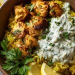 - Serve: Once the chicken and rice are cooked, remove the dish from the oven. Divide the contents into four bowls. Top each serving with tzatziki sauce, a wedge of lemon, and a sprinkle of fresh chopped parsley for a vibrant presentation and fresh flavor boost.