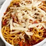 - Garnish and Serve: Once baked, sprinkle 1 cup of Parmesan cheese shavings over the top for garnish. Serve the baked spaghetti Bolognese warm for a comforting meal.