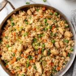 This Easy Chicken Fried Rice recipe is a quick and flavorful dish made with day-old rice, tender chicken pieces, fresh vegetables, and savory seasonings. Perfect for a simple weeknight dinner, it combines sautéed chicken, onions, peas, carrots, scrambled eggs, and soy sauce for a classic takeout-style fried rice at home.