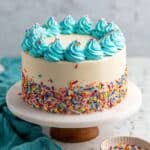 - Decorate: Finish by decorating the cake’s top and sides with additional rainbow sprinkles for a festive touch. Slice, serve, and enjoy your colorful Funfetti cake!