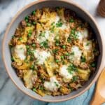 This Easy Ground Turkey Cabbage Skillet is a one-pan, wholesome meal combining lean ground turkey, nutritious cabbage, and savory tomato sauce. Perfect for a quick, healthy dinner that’s better than boring diet food, it’s packed with flavor, easy to prepare, and topped with melted mozzarella and fresh parsley for a delicious finish.