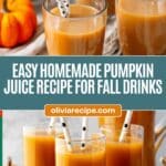 When properly stored in an airtight container, this pumpkin juice stays fresh for up to 4 days. Make sure to stir or shake before serving as ingredients may settle.