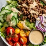 These Healthy Burger Bowls offer a flavorful and lighter alternative to traditional burgers by skipping the bun and serving seasoned ground beef over a bed of fresh romaine lettuce and garden vegetables. Topped with a tangy homemade special sauce, this recipe is perfect for a quick, satisfying, and low-carb meal.