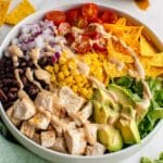 A vibrant and healthy Southwest Chicken Salad featuring fresh vegetables, lean chicken breast, and a creamy chipotle Southwest dressing. This salad combines crisp romaine, juicy grape tomatoes, sweet corn, black beans, and crunchy corn chips for a perfect balance of textures and flavors. Topped with shredded cheddar cheese and fresh cilantro, it’s a quick, nutritious, and satisfying meal ideal for lunch or dinner.