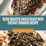 This Hummus with Slow-Cooked Spiced Chuck Roast Recipe loves company! Serve alongside warm pita bread, crunchy pita chips, or pillowy naan to scoop up every luscious bite. A crisp cucumber or tomato salad offers a refreshing balance, while pickled vegetables can add tangy contrast to the richness.
