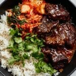 This Korean Style Pot Roast is a flavorful and tender beef dish, inspired by traditional Korean flavors with a spicy and slightly sweet sauce featuring gochujang paste, garlic, ginger, and soy sauce. Slow-cooked to perfection, the chuck roast becomes melt-in-your-mouth tender and is served family-style alongside fluffy rice, fresh cilantro, and tangy kimchi for a hearty and comforting meal.
