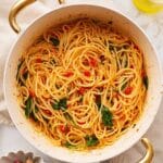 This simple and fresh pasta recipe, favored by Meghan Markle, combines garlic, grape tomatoes, spinach, and Parmesan cheese for a vibrant, flavorful dish that cooks entirely in one pot. The pasta simmers directly in boiling water with herbs and seasonings, absorbing all the rich flavors for a quick, satisfying meal perfect for any weeknight.