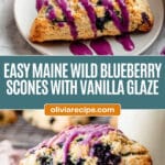 These Maine Wild Blueberry Scones are tender, flaky, and bursting with the fresh flavor of wild blueberries. Perfectly golden and topped with a sweet blueberry glaze, they are a delightful treat for breakfast or afternoon tea. Made with cold butter for a flaky texture, these scones balance sweetness with the natural tartness of wild blueberries.