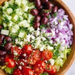 - Prepare the Salad: In a large salad bowl, combine the chopped lettuces, cherry tomatoes, diced red onion, chopped cucumber, Kalamata olives, feta cheese crumbles, and fresh parsley.