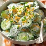 Million Dollar Cucumber Salad is a quick and flavorful side dish featuring crisp English cucumbers tossed with creamy ranch dressing, bacon bits, sharp cheddar cheese, green onions, and aromatic herbs. This easy-to-make salad is perfect for potlucks, BBQs, or a refreshing snack.