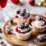 These Mini Cranberry Mousse Cakes are a delightful no-bake dessert featuring a crunchy graham cracker crust topped with a creamy, tangy cheesecake mousse and a swirl of cranberry sauce. Perfectly portioned as individual servings, they are ideal for holiday celebrations or any festive occasion.