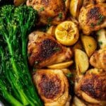 This one-pan lemon garlic chicken and potatoes recipe is a simple and flavorful meal featuring bone-in, skin-on chicken thighs marinated in a zesty blend of lemon, garlic, and herbs, then baked alongside golden potato wedges. The citrus and aromatic herbs infuse the dish with bright, fresh flavors, while baking ensures juicy chicken with crispy skin and tender, savory potatoes. Perfect for an easy weeknight dinner or meal prep, this dish requires minimal cleanup and delivers comforting, wholesome satisfaction.