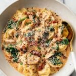 This One Pan Tortellini with Chicken is a creamy, comforting, and easy-to-make dish perfect for a quick weeknight dinner. Tender cheese tortellini and shredded rotisserie chicken simmer in a flavorful tomato-cream sauce packed with garlic, Italian seasoning, and fresh baby spinach. Prepared all in one skillet, it minimizes cleanup and maximizes deliciousness with a smooth, rich sauce and a hint of spice from crushed red pepper flakes. Ready in just 30 minutes, this recipe is perfect for busy home cooks craving a satisfying meal.