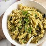 - Garnish and Serve: Garnish with fresh oregano or basil if desired. Serve the creamy pesto pasta warm.