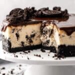 - Decorate the cheesecake: Pour the ganache evenly over the chilled cheesecake. Decorate with additional crushed Oreo cookies and whole Oreos as desired.