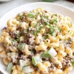 - Serve: Serve the Philly Cheesesteak Mac and Cheese immediately, optionally topping with diced green onions for added freshness and flavor.