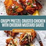 - Serve: Plate the pretzel-crusted chicken and drizzle with cheddar mustard sauce. Garnish with chopped parsley and finely chopped red onion for a fresh finish.